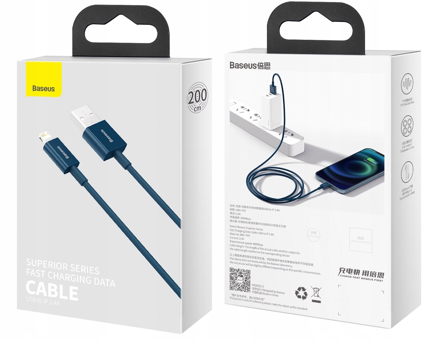 BASEUS KABEL USB LIGHTNING DO APPLE IPHONE 2.4A DŁUGI PRZEWÓD 2M BEZPIECZNY Stan opakowania oryginalne