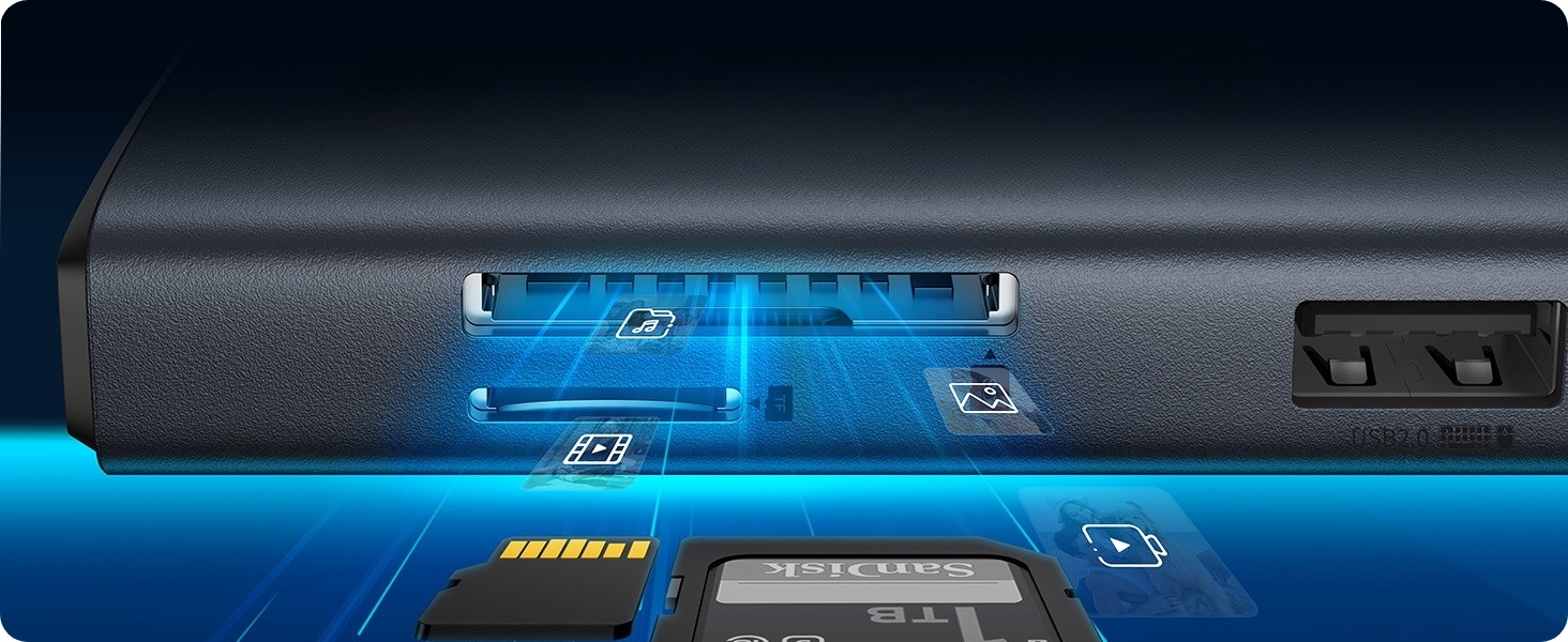 Adapter wyposażony jest w porty TF i SD, które oferują wygodny i szybki dostęp do danych na kartach pamięci: