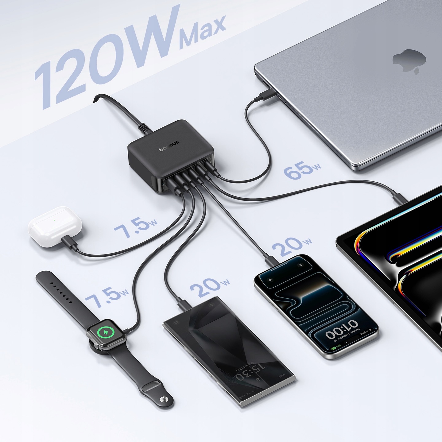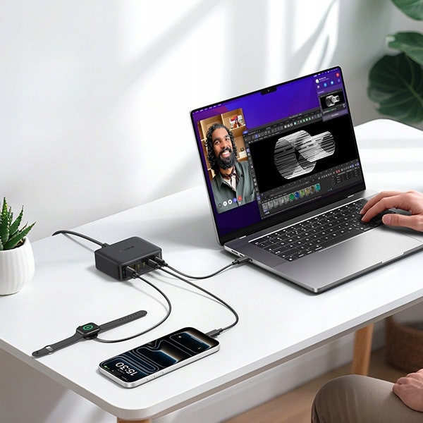 Kompaktowa stacja ładująca na biurko o mocy do 120W, umożliwiająca jednoczesne ładowanie nawet 6 urządzeń. Wyposażona w 4 porty USB-C oraz 2 porty USB-A, automatycznie rozdziela moc w zależności od podłączonego sprzętu.